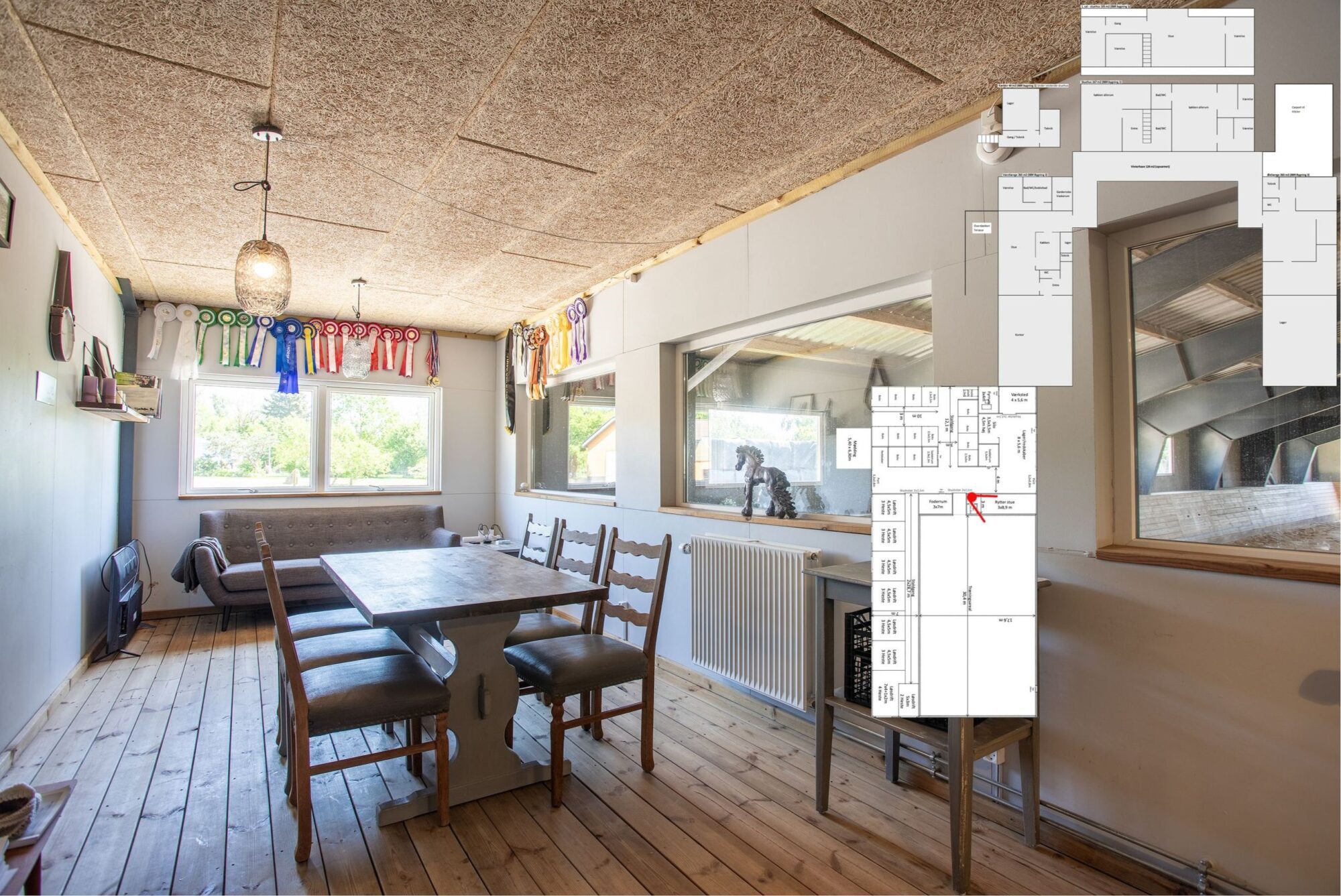 Mulighed for tre boligenheder med samlet areal af boliger, opvarmet vinterhave, og lækre ekstrarum på 530 m2. Plads til familieliv, hestehold og erhverv. Bygninger til bolig og erhverv har mere end 1000 m2 opvarmet areal. Ridehus, ridebane og stalde til 40 islandsheste, og 13 ha jord.
