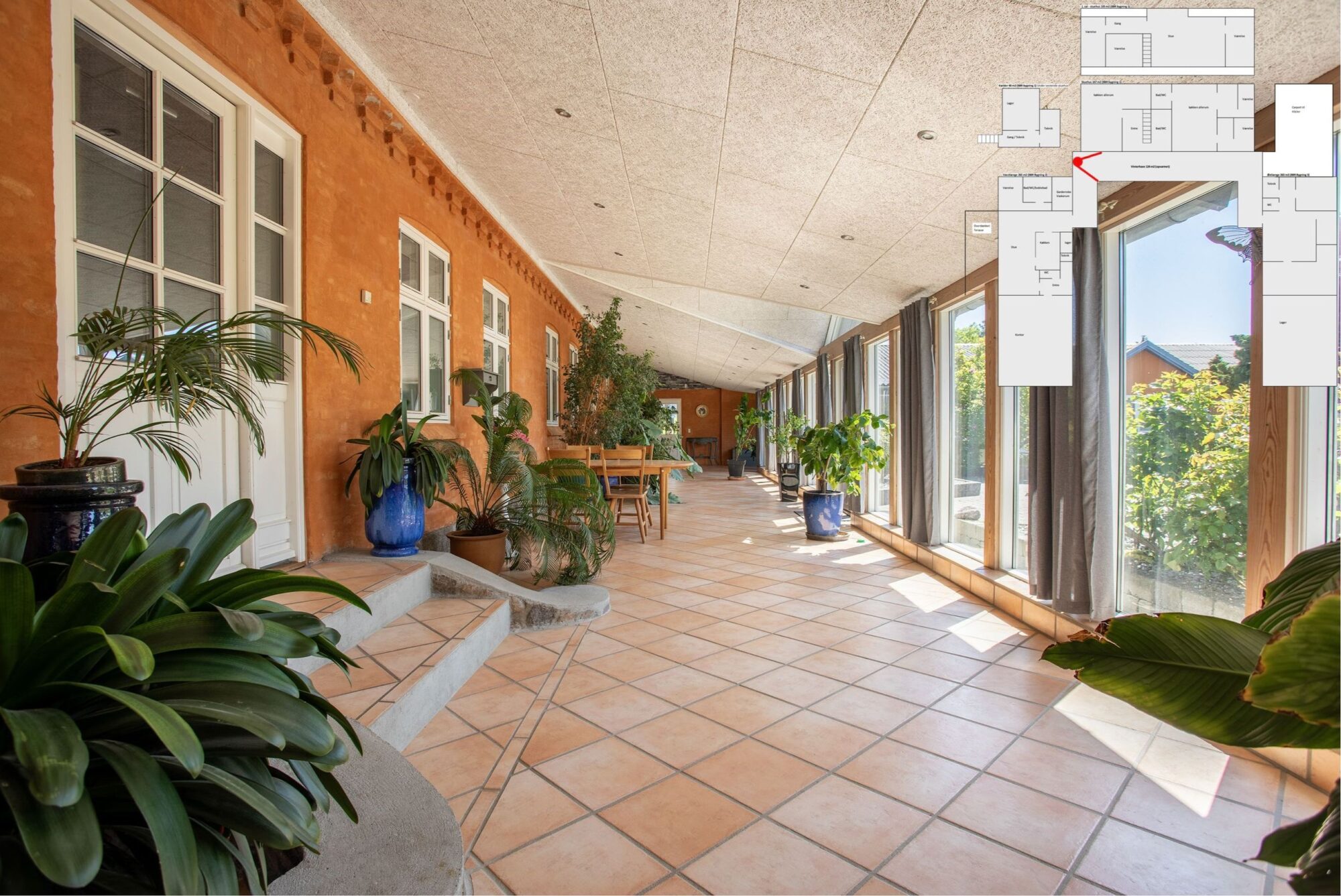 Stuehus og den vestlig kontorbygning er indrettet med flere selvstændige boligenheder der bindes sammen af en stor, lys vinterhave, der skaber et fælles og indbydende samlingspunkt. Boliger og vinterhave rummer samlet 530 m² beboelse.