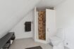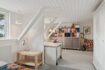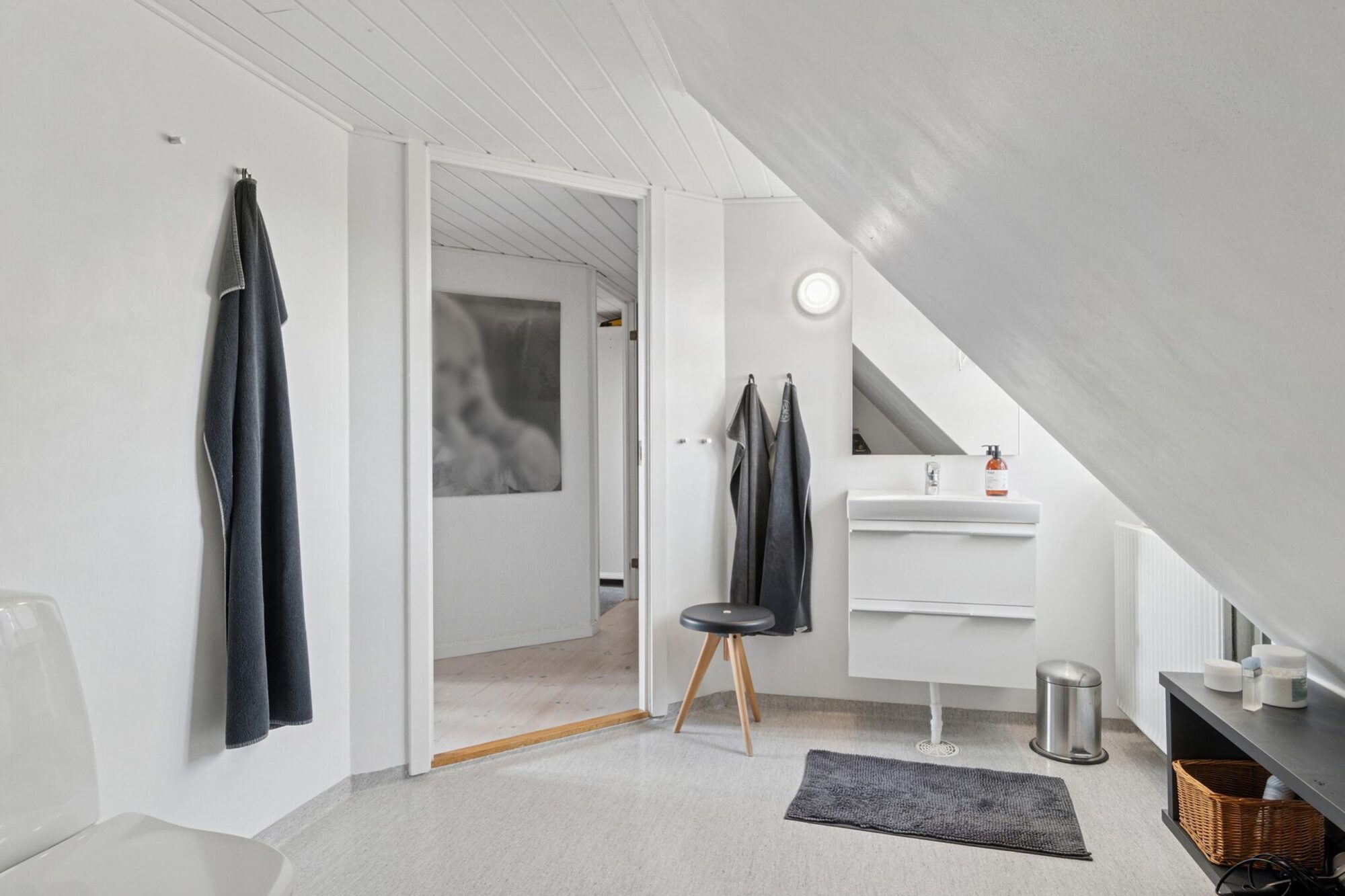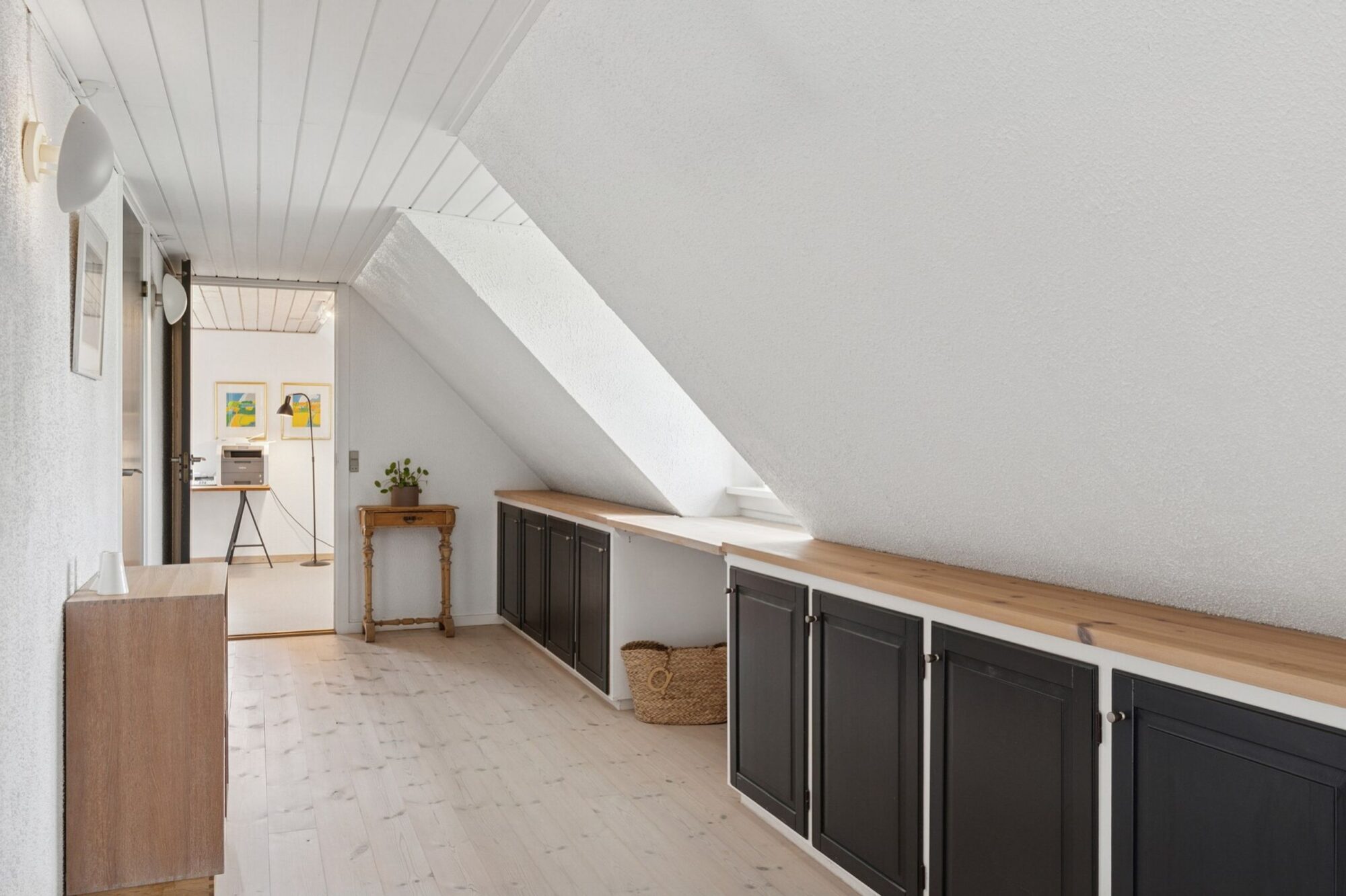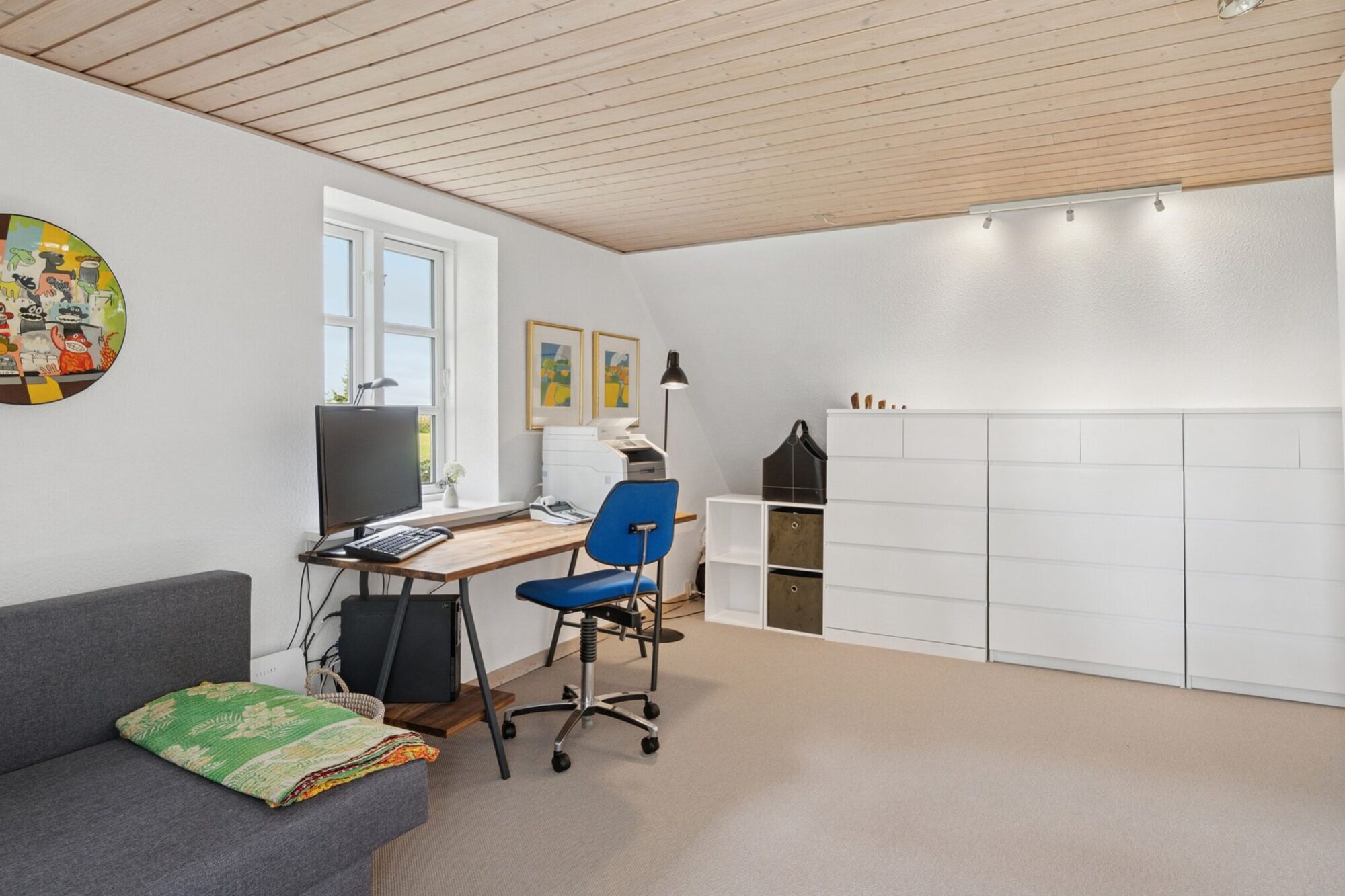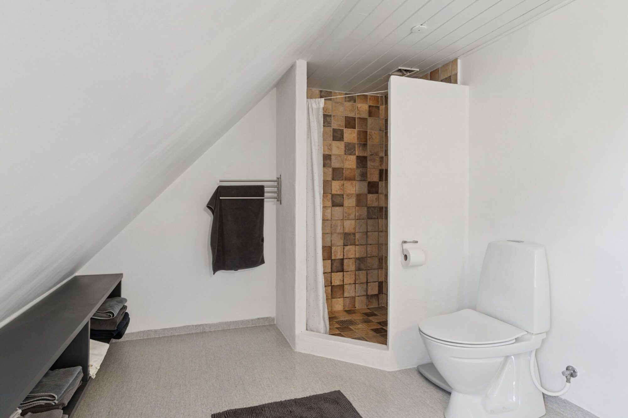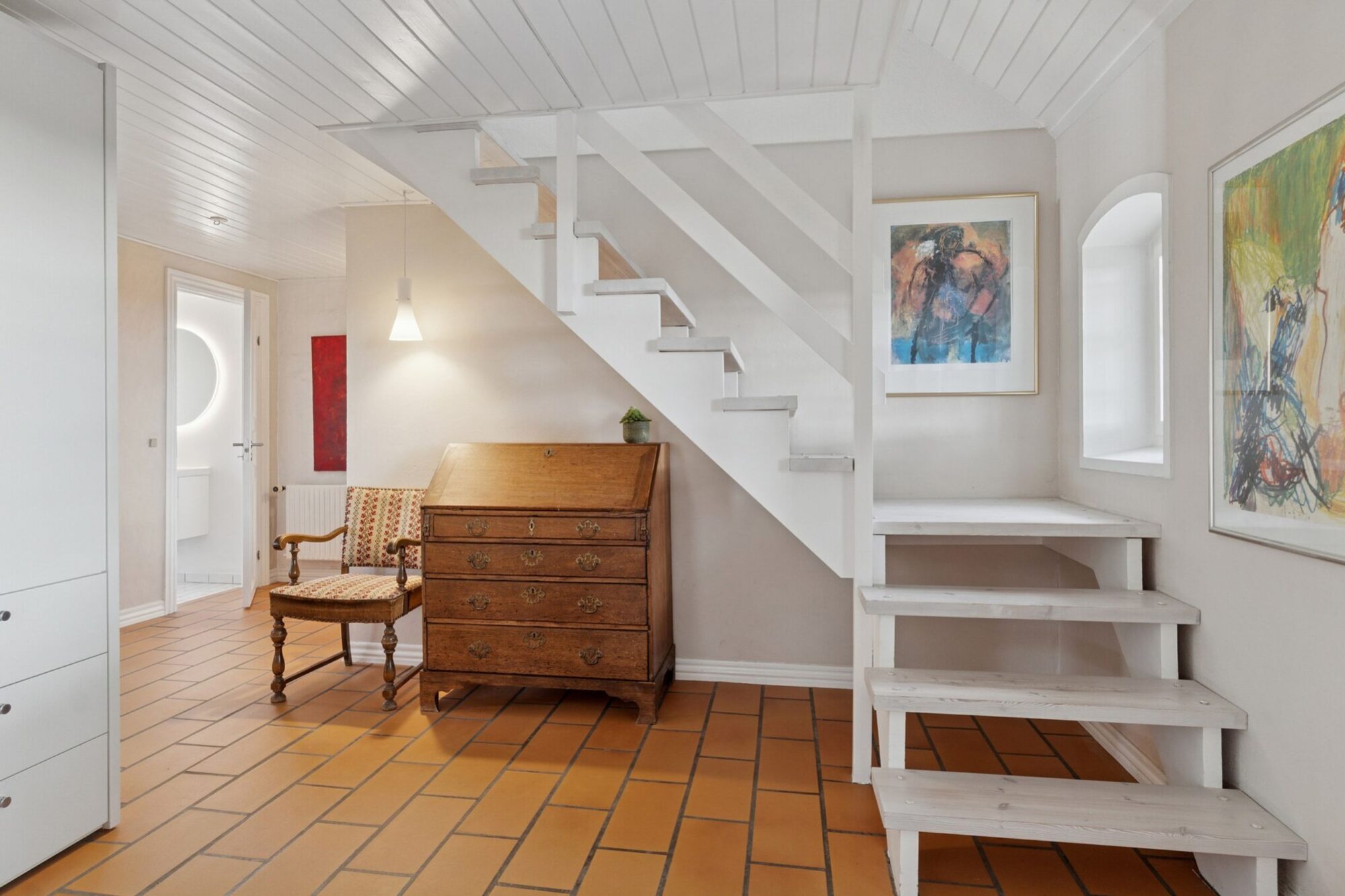 Stuehuset er virkeligt flot, lyst og tidssvarende, og fordelt på to etager. Den familievenlige planløsning rummer blandt andet tre soveværelser (hvor det ene oprindeligt har været to), der alle er etableret på førstesalen. Værelserne er store og har en fritliggende charmerende bjælkekonstruktion. 1.salen indeholder derudover et walk-in-closet og et badeværelse samt en møblerbar repos.