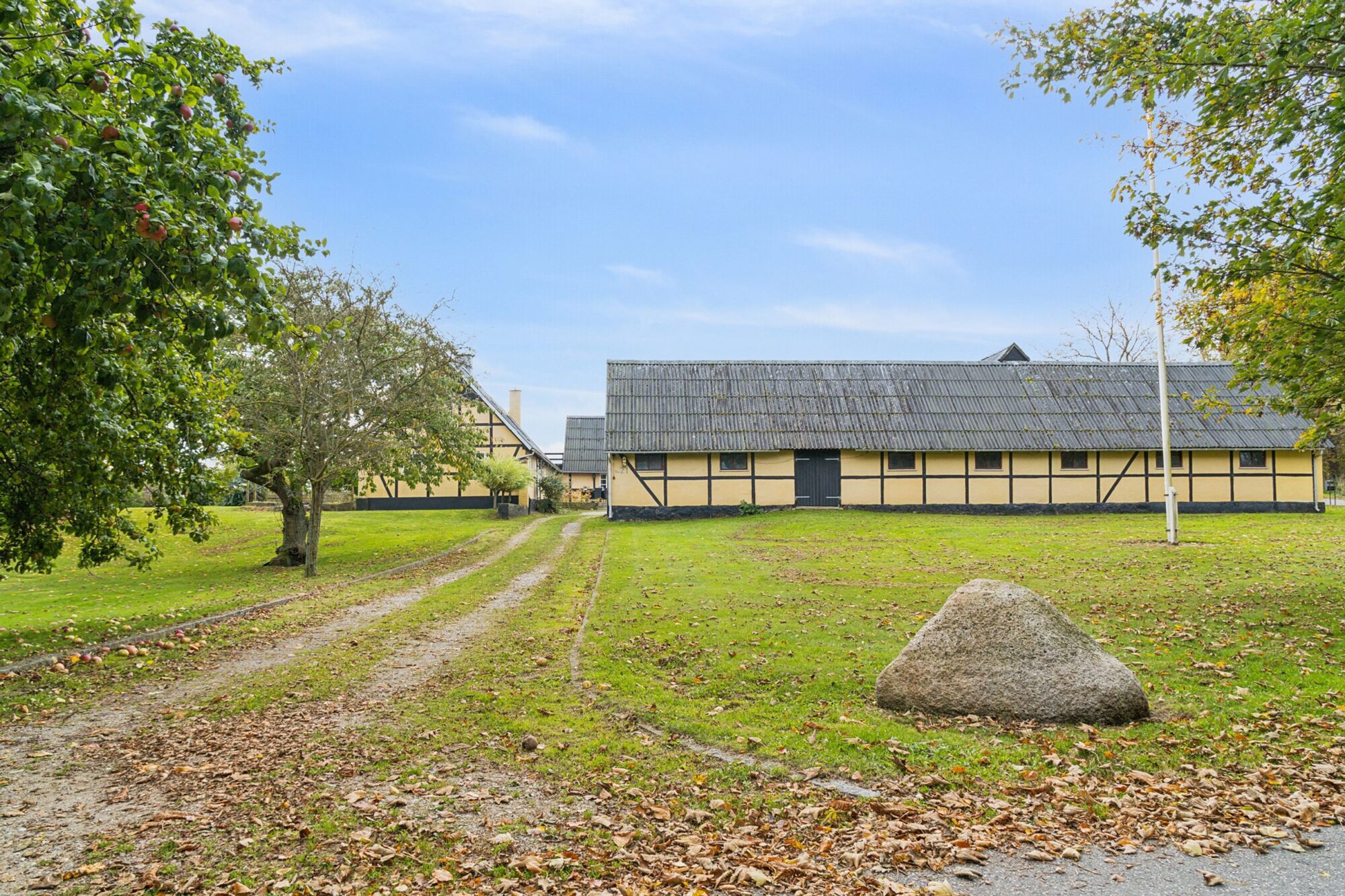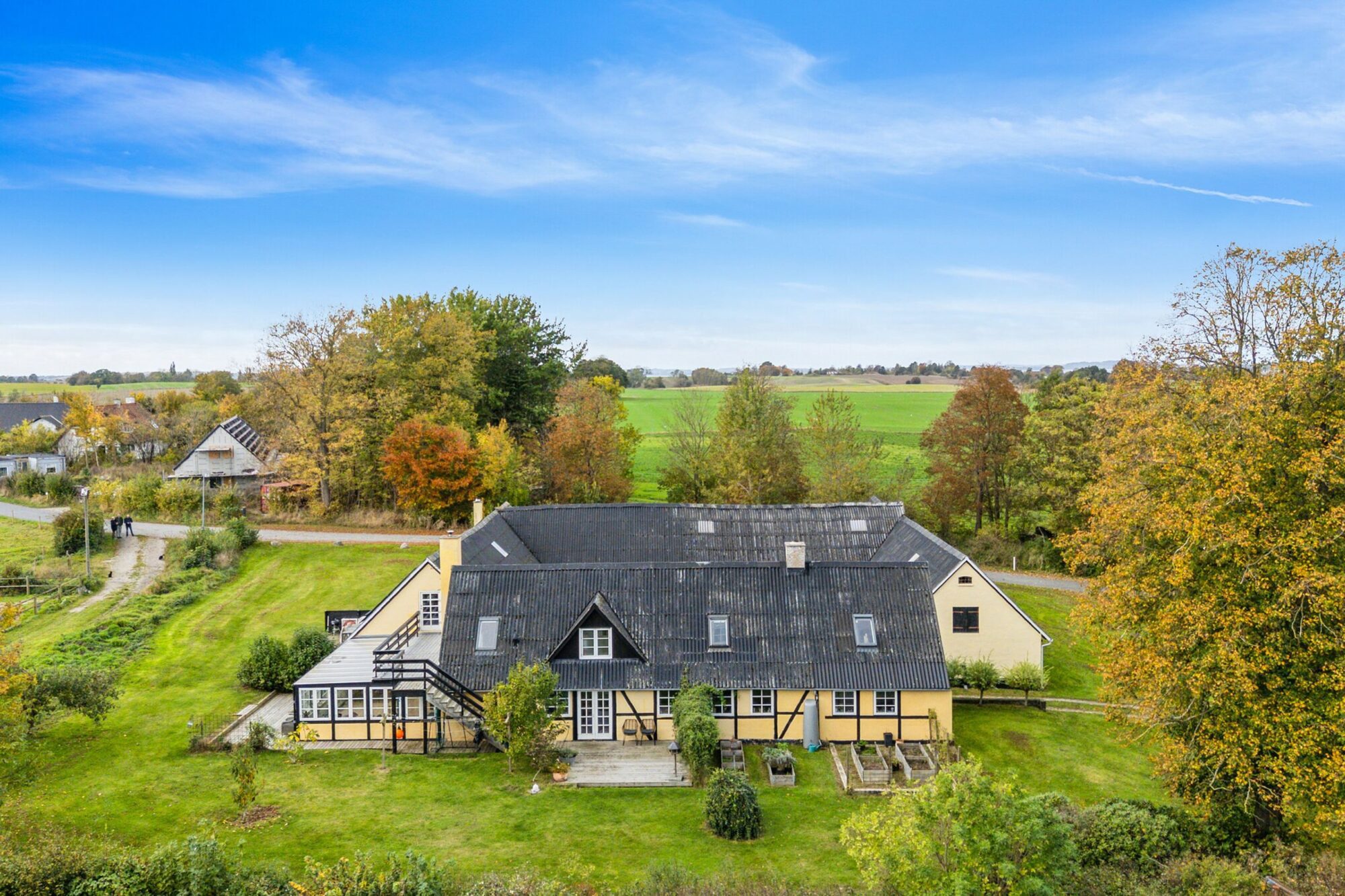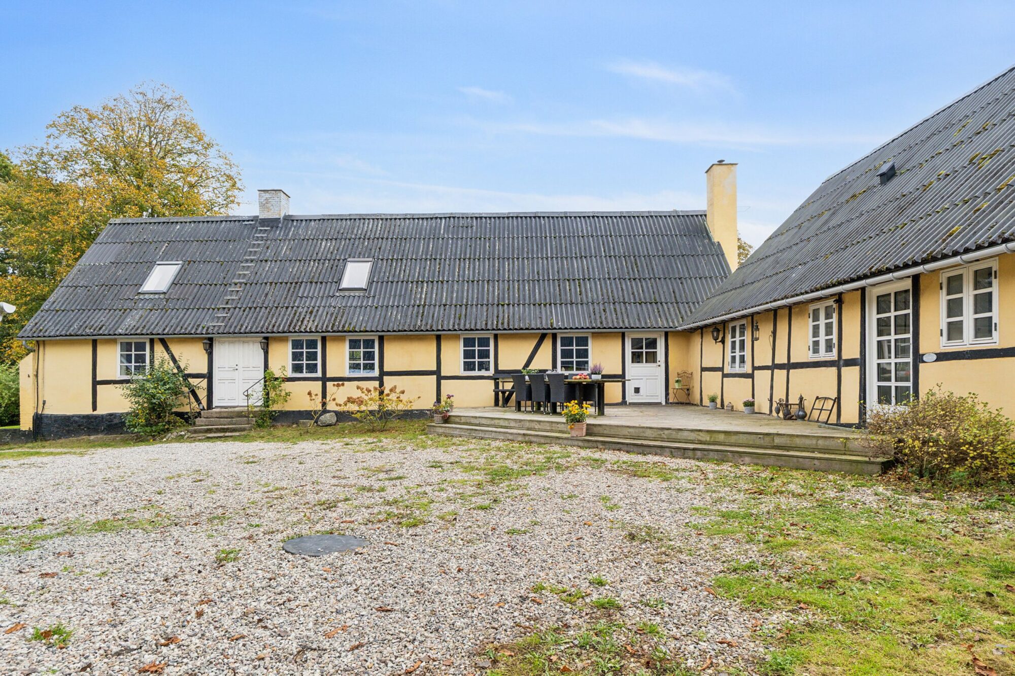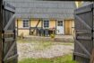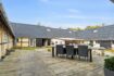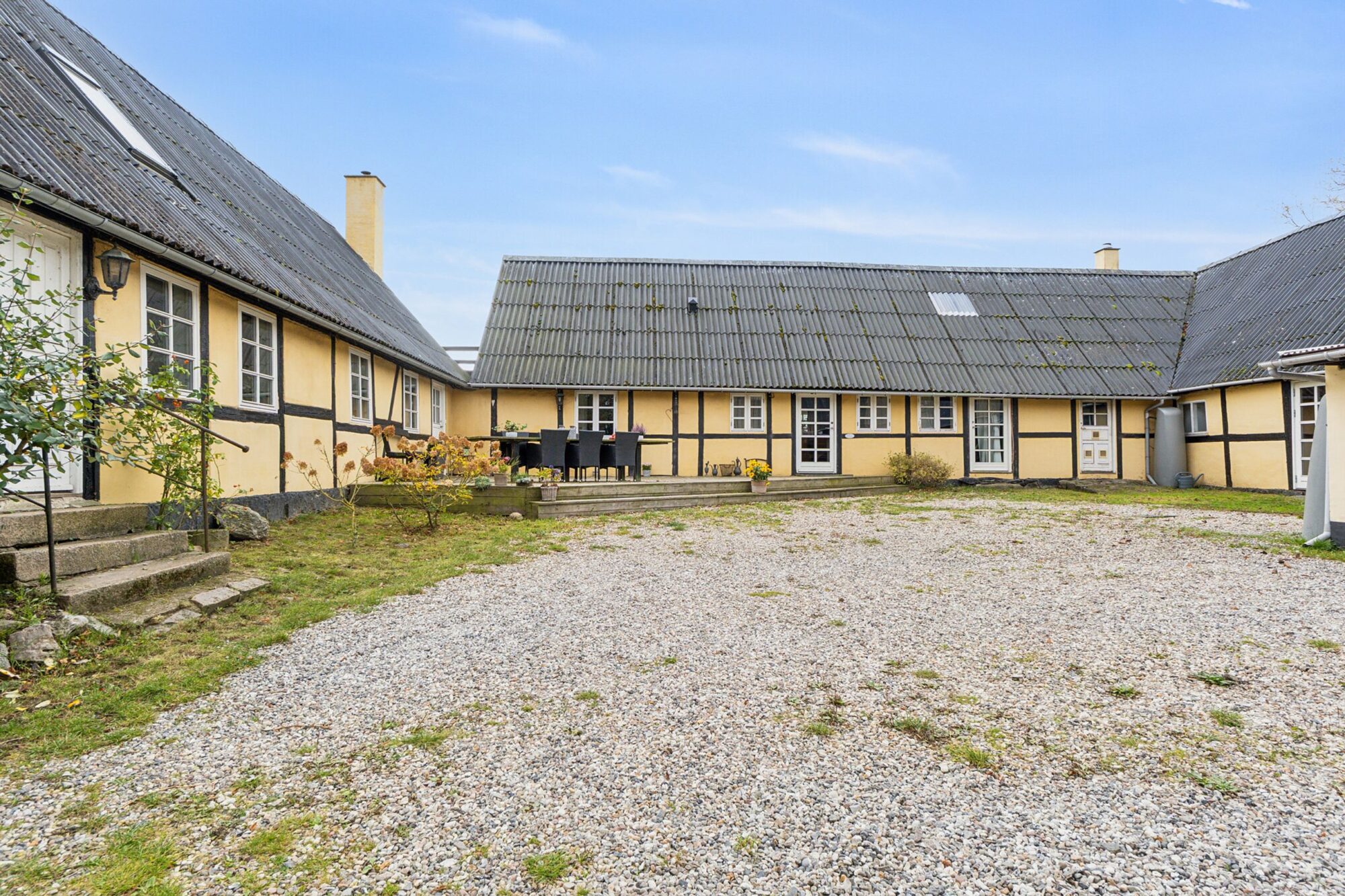Når man ankommer, kommer man via den gamle vognport ind til en hyggelig gårdsplads med terrasse og adgang til både stuehus og udlænger. Stuehuset er på 315 m² og rummer i dag to separate boliger.