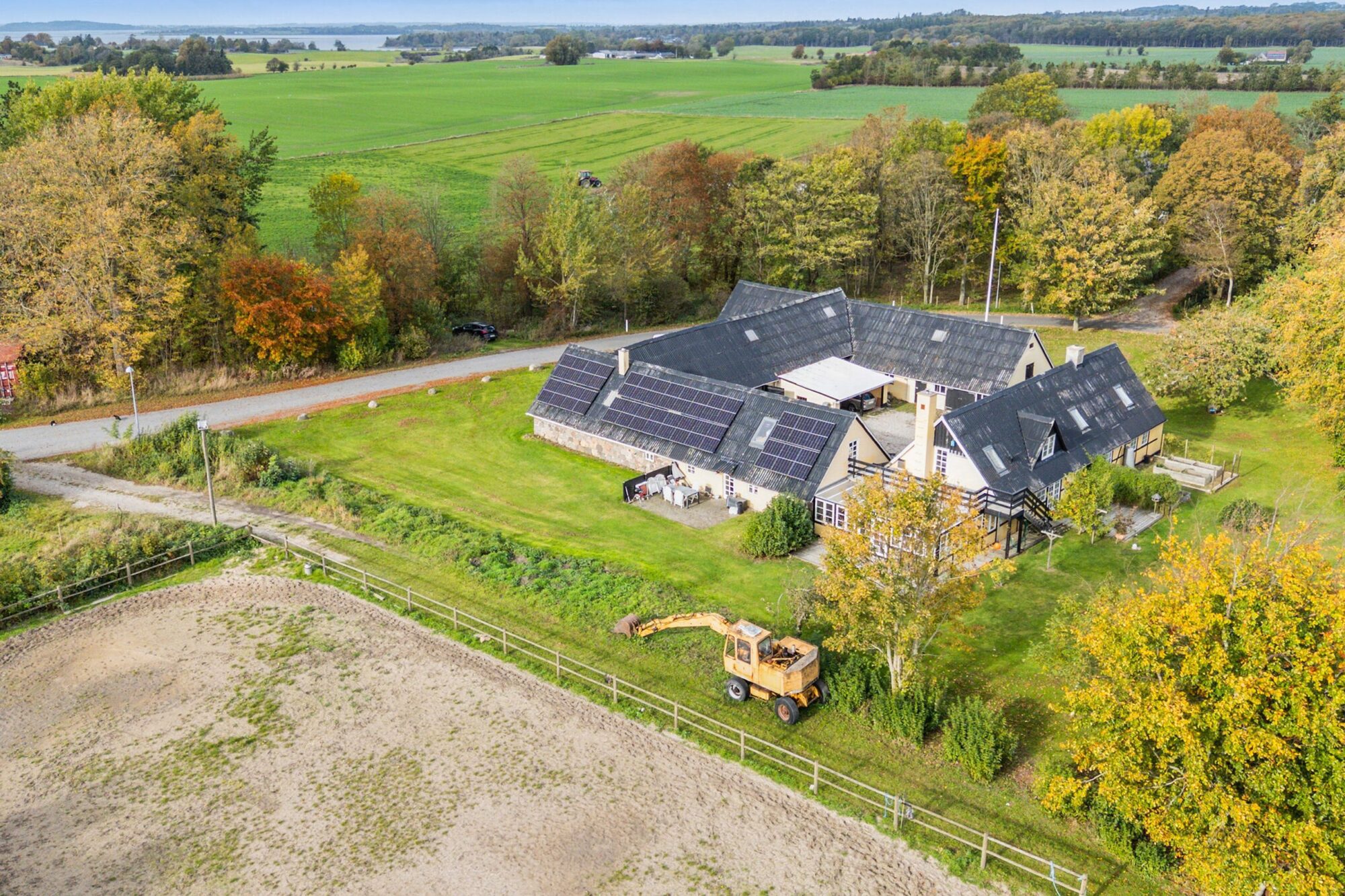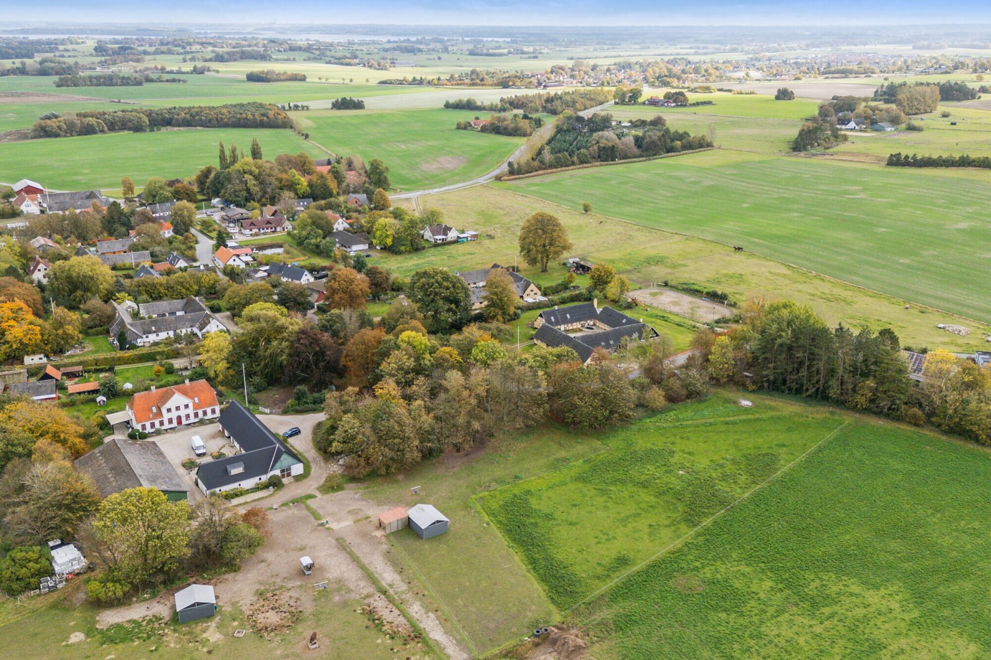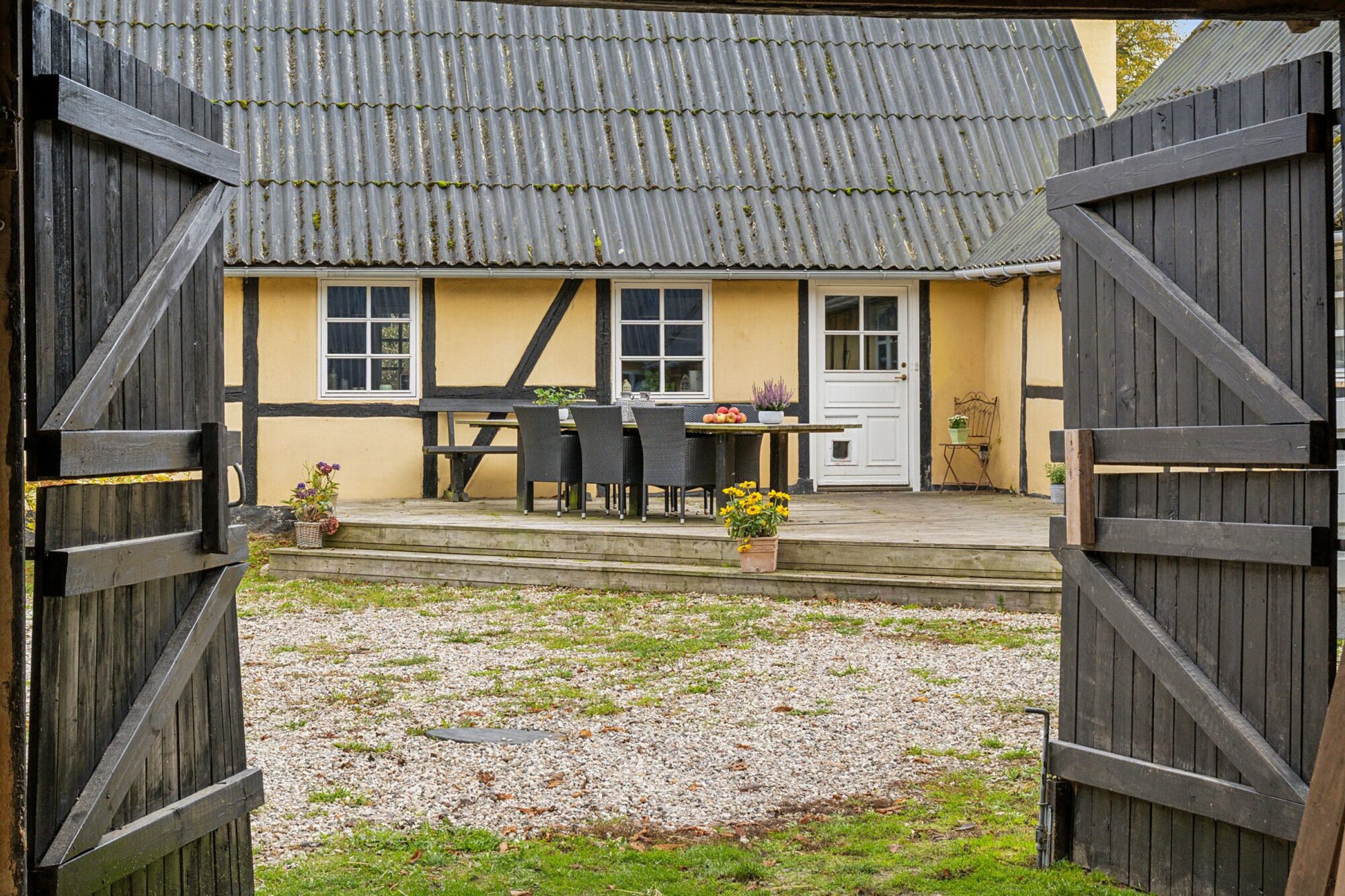Når man ankommer, kommer man via den gamle vognport ind til en hyggelig gårdsplads med terrasse og adgang til både stuehus og udlænger. Stuehuset er på 315 m² og rummer i dag to separate boliger.