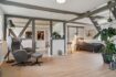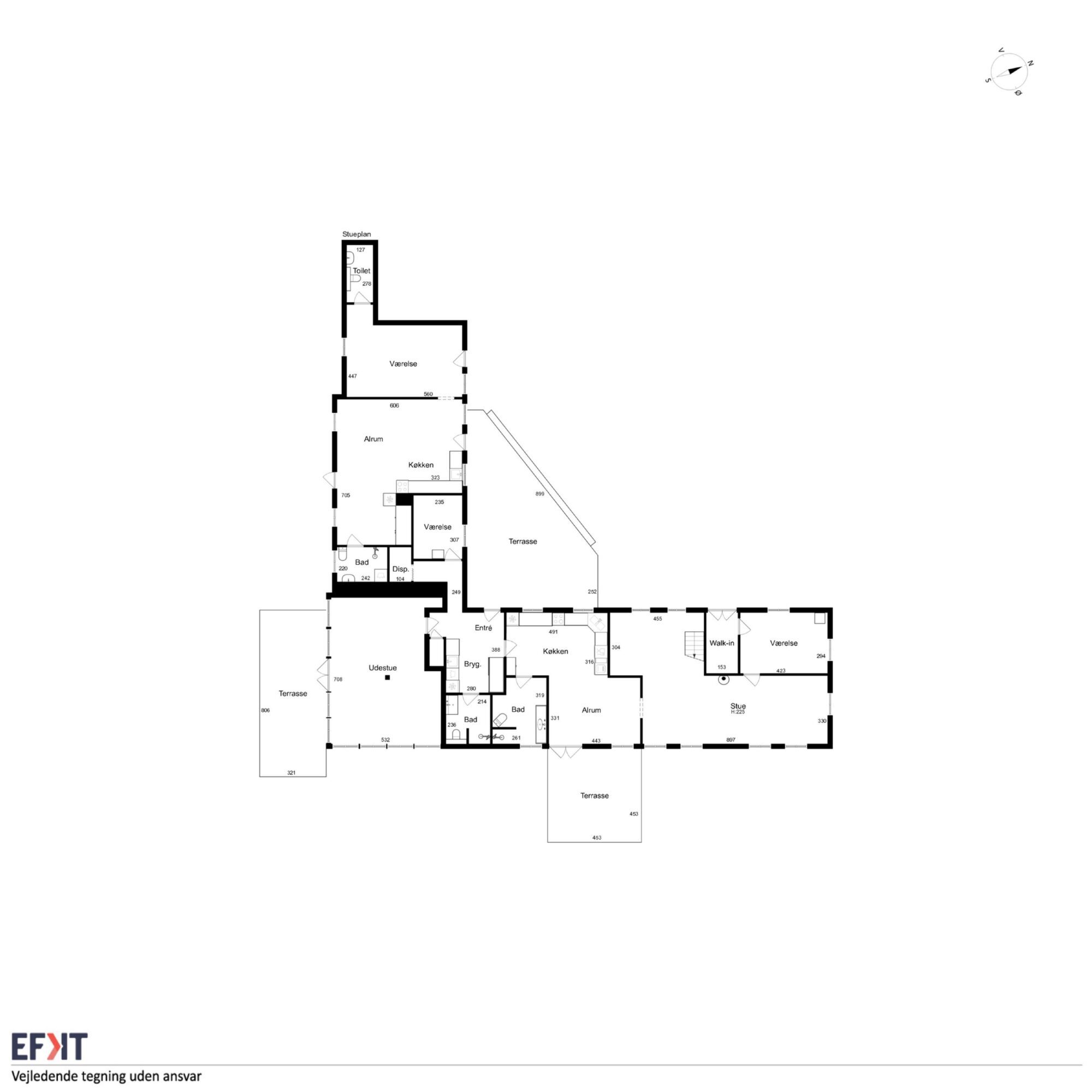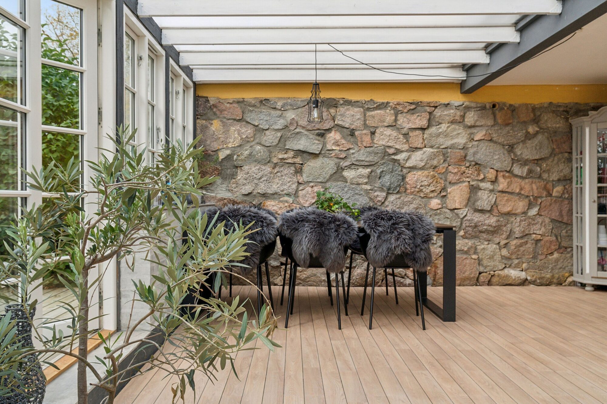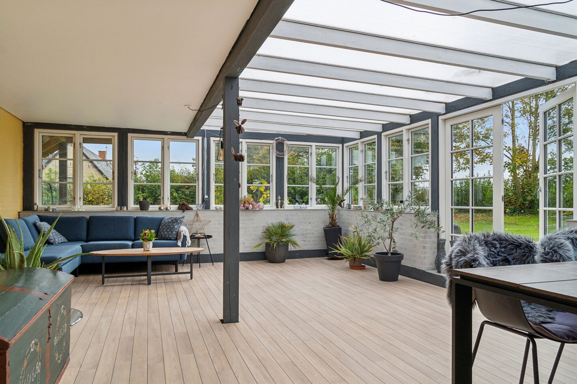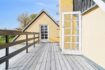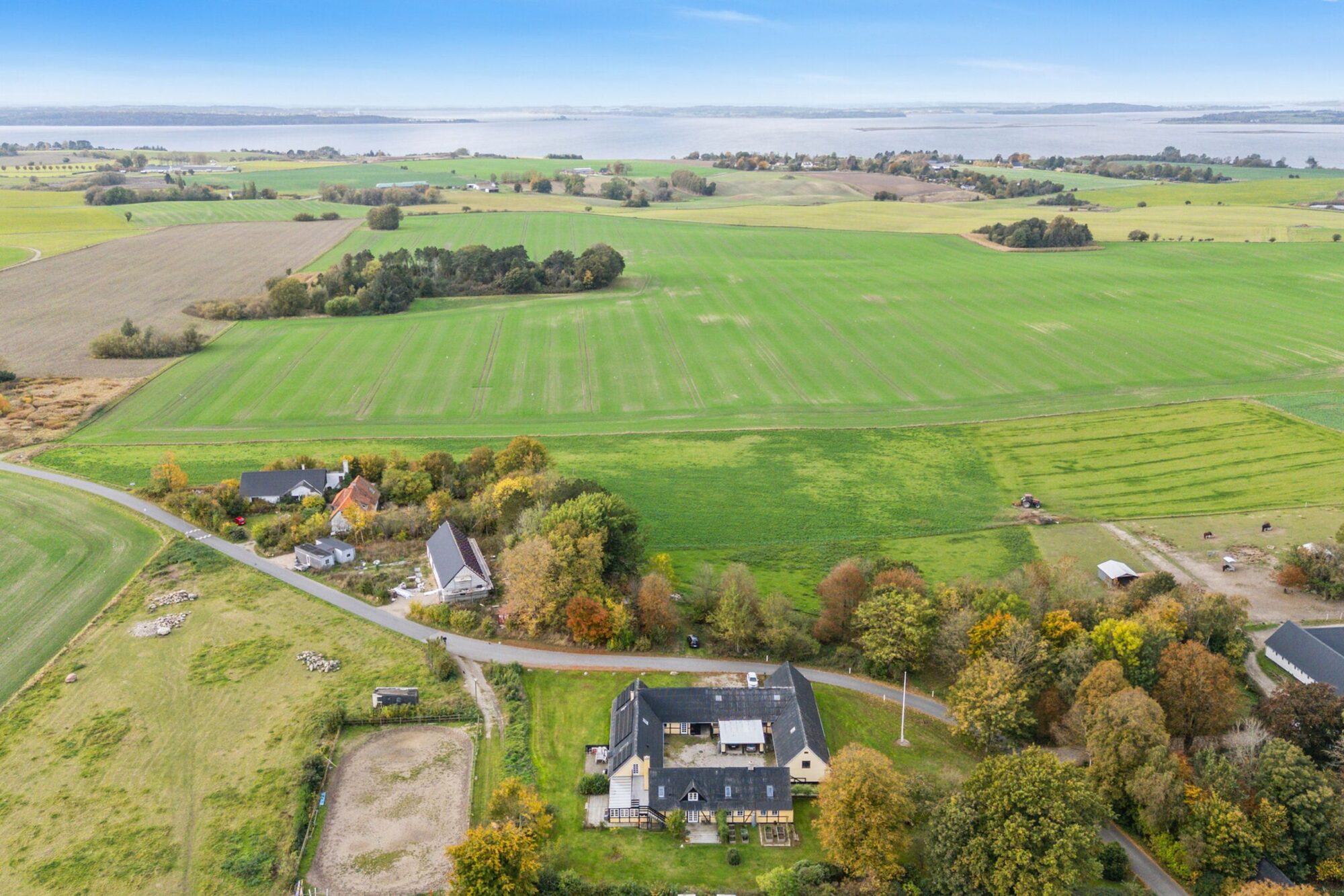 Når man ankommer, kommer man via den gamle vognport ind til en hyggelig gårdsplads med terrasse og adgang til både stuehus og udlænger. Stuehuset er på 315 m² og rummer i dag to separate boliger.