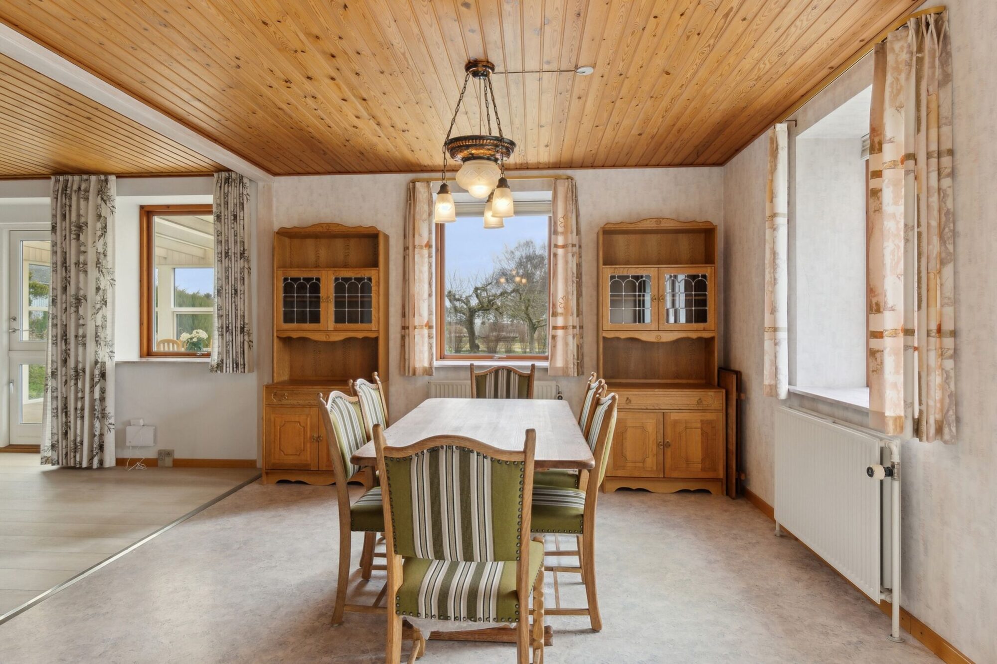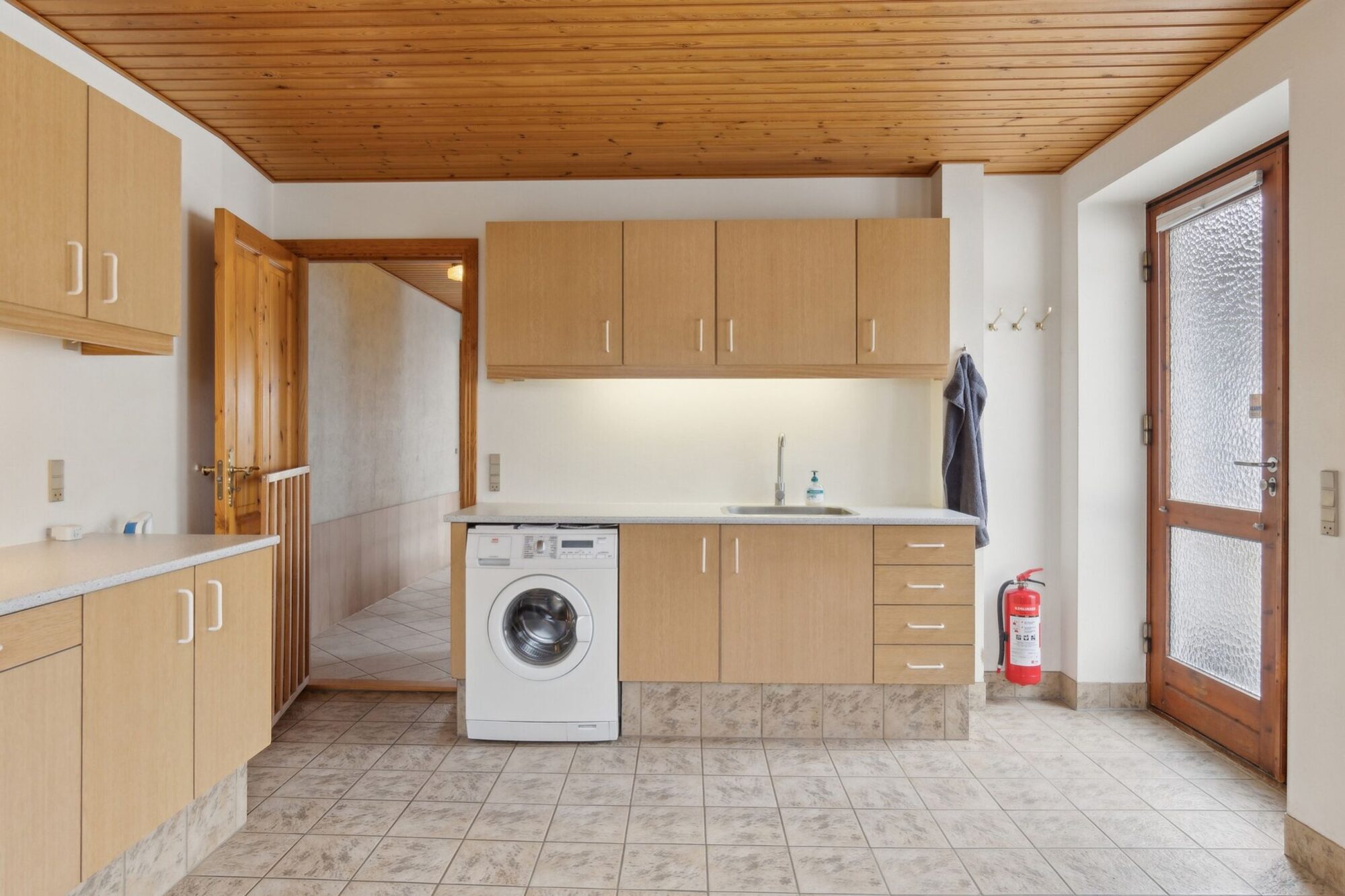 Stuehuset har et stort bryggers, badeværelse samt entre med trappe til 1. salen. Stort opholdsrum med køkken og stue i åben forbindelse, hvorfra der er udgang til dejlig udestue. På 1 salen er der tre store værelser og et badeværelse.