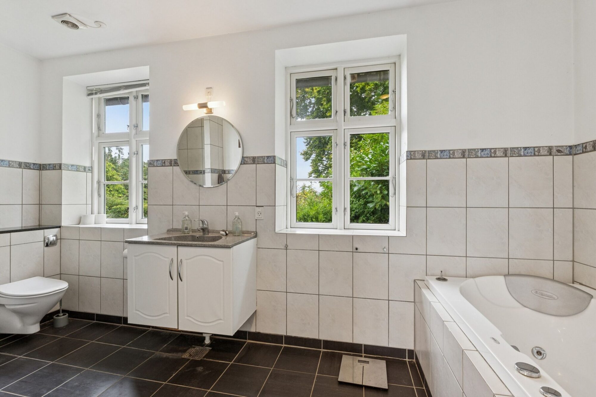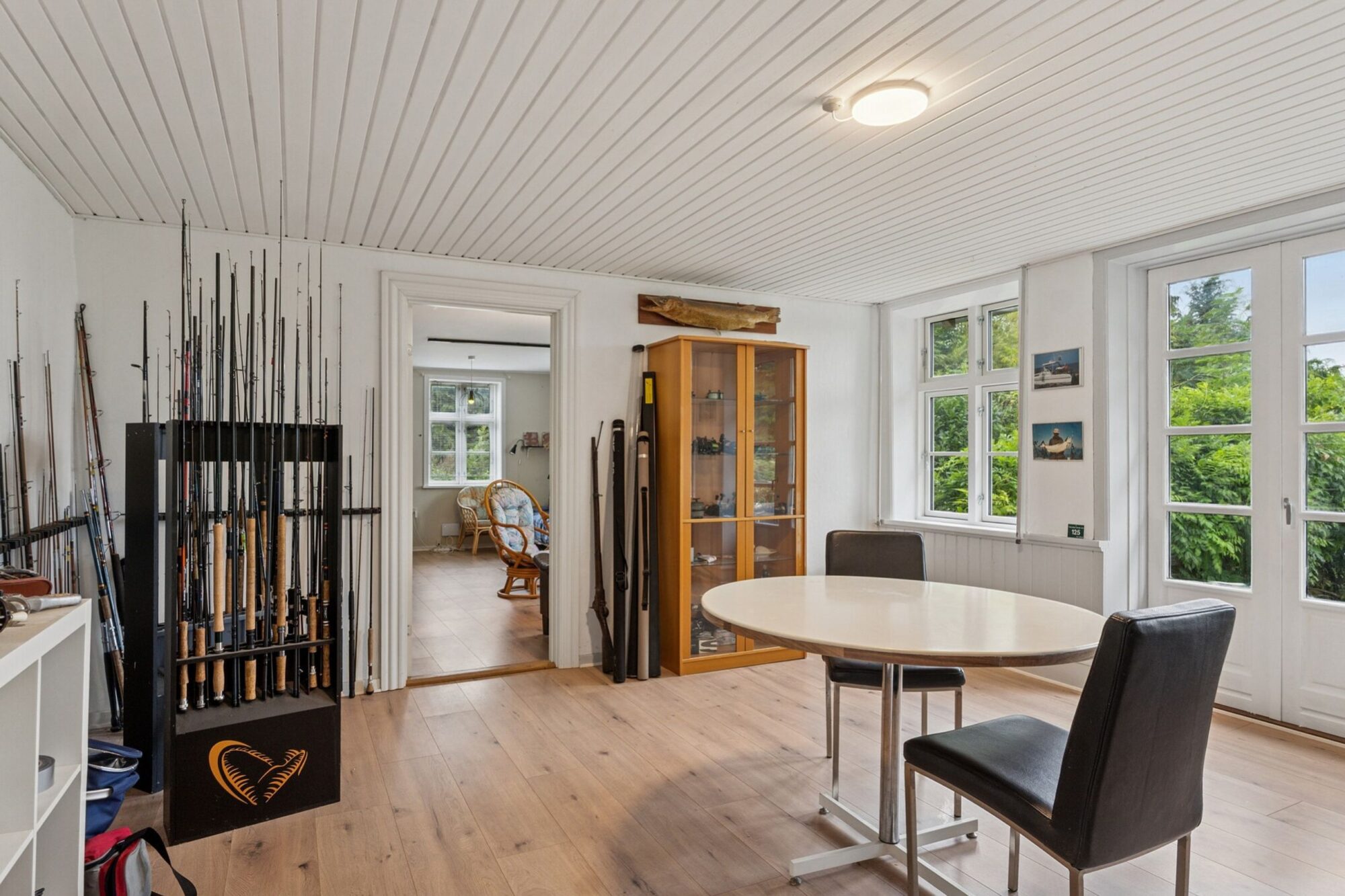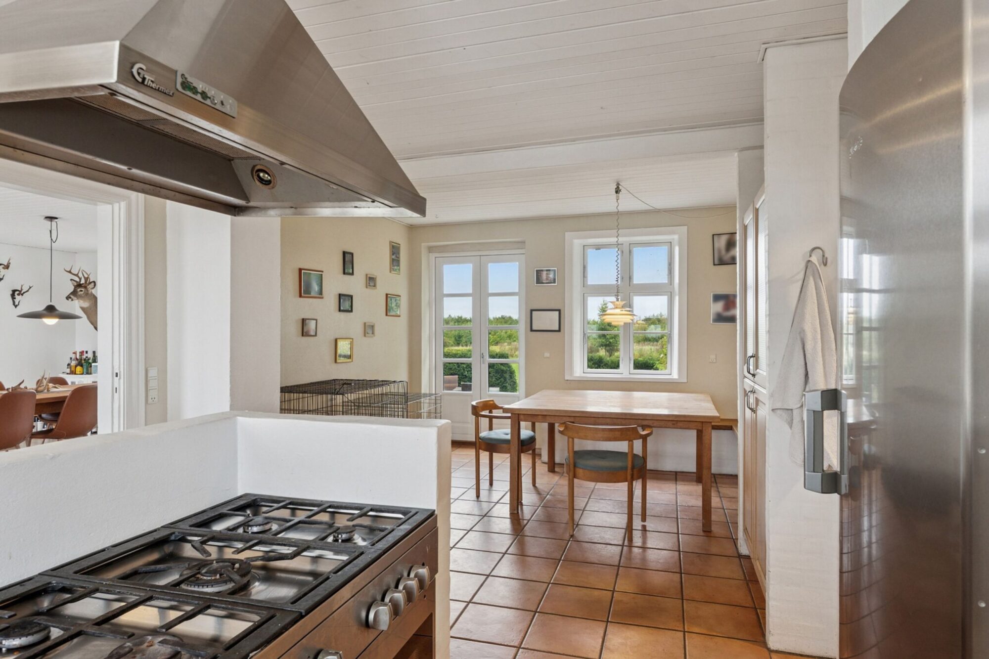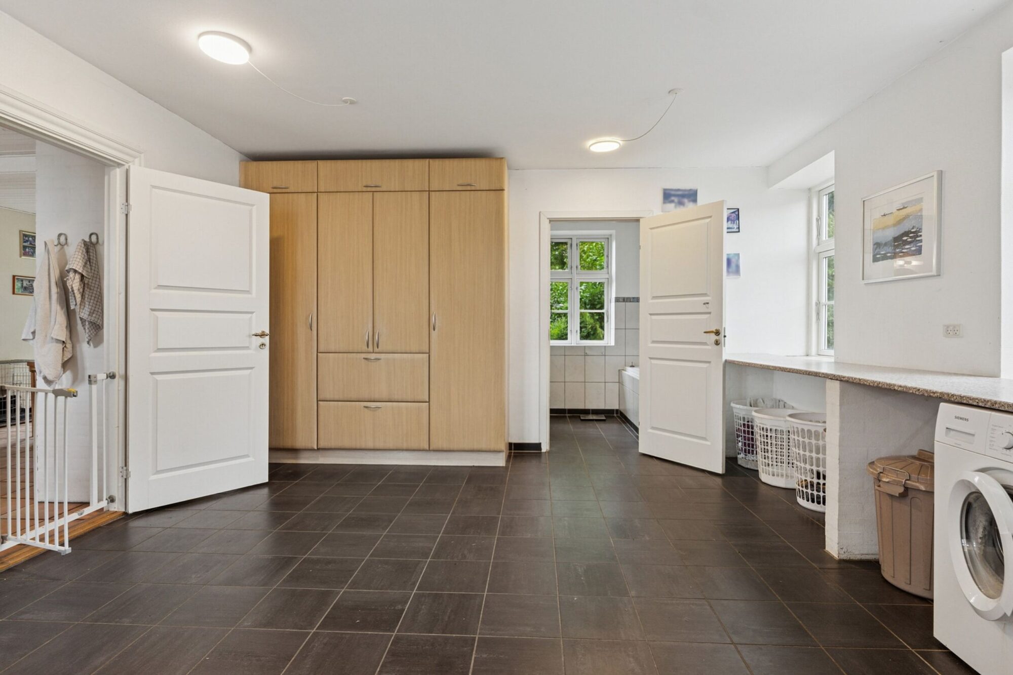 Stuehusets mange kvadratmeter indeholder et meget stort bryggers, badeværelse, spisekøkken samt flere stuer og værelser – og endnu et badeværelse. 1. salen rummer også en stue samt flere værelser. Fra huset er der udgang til en stor terrasse med udsigt over folde og skov.