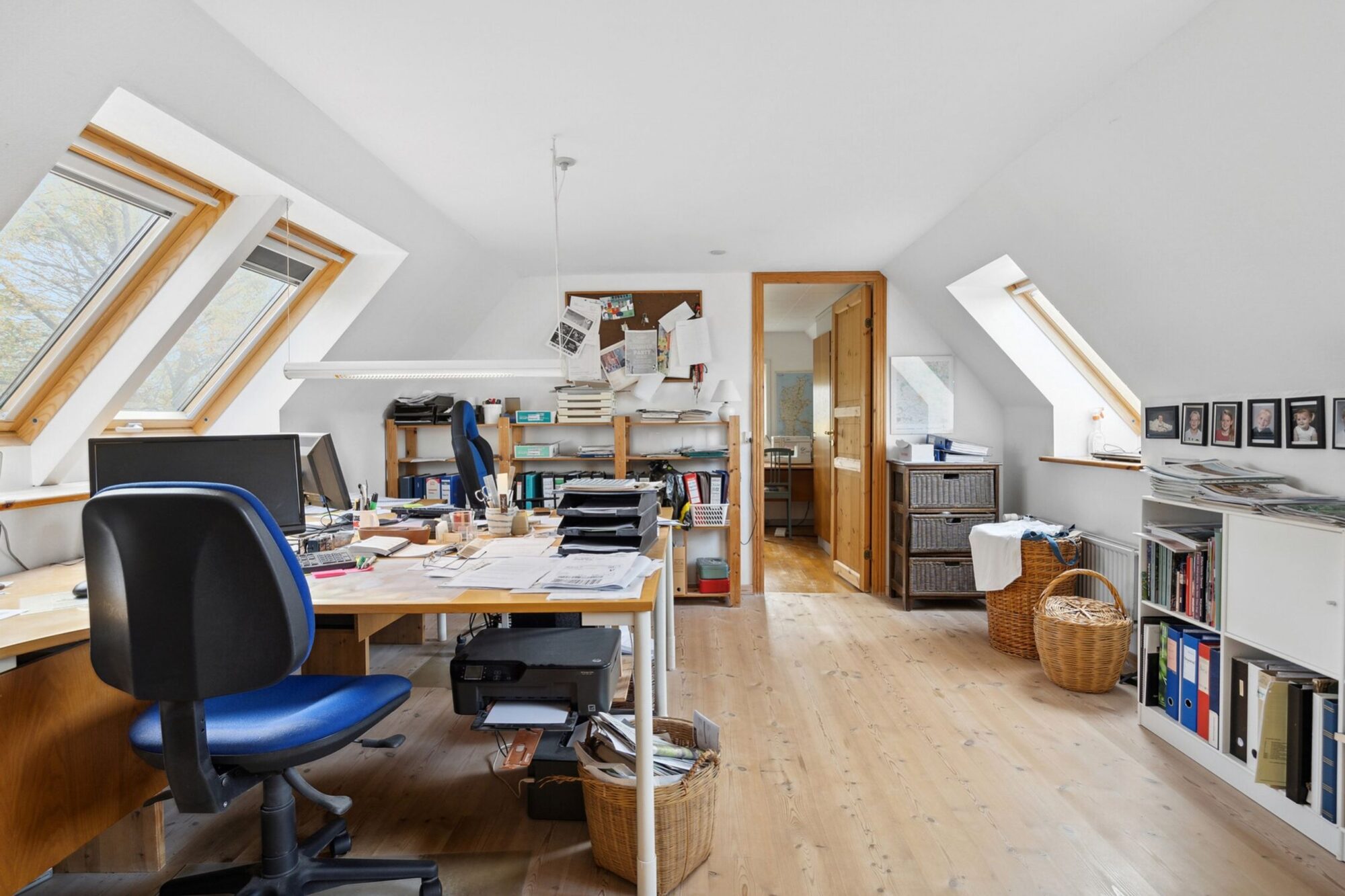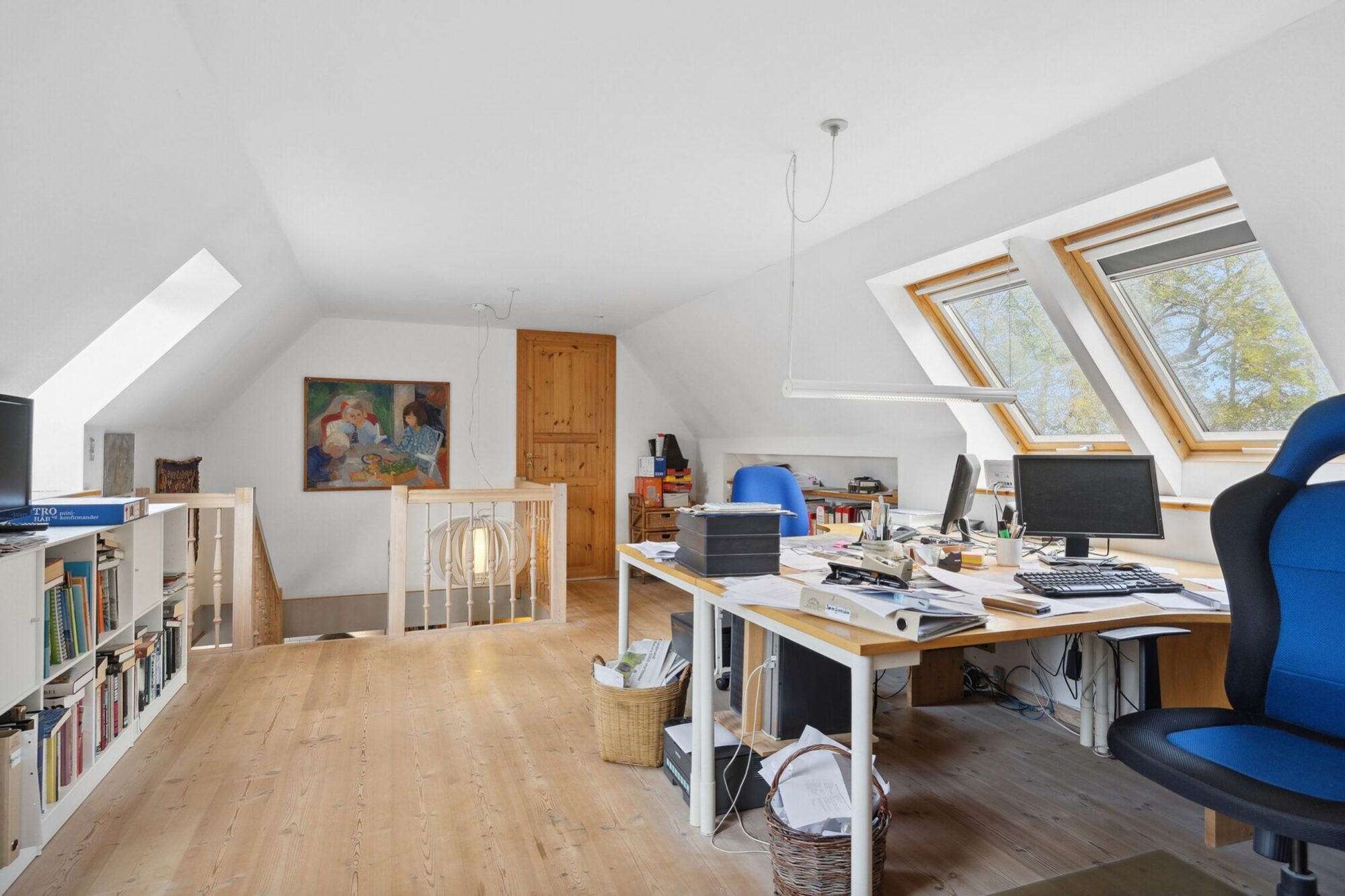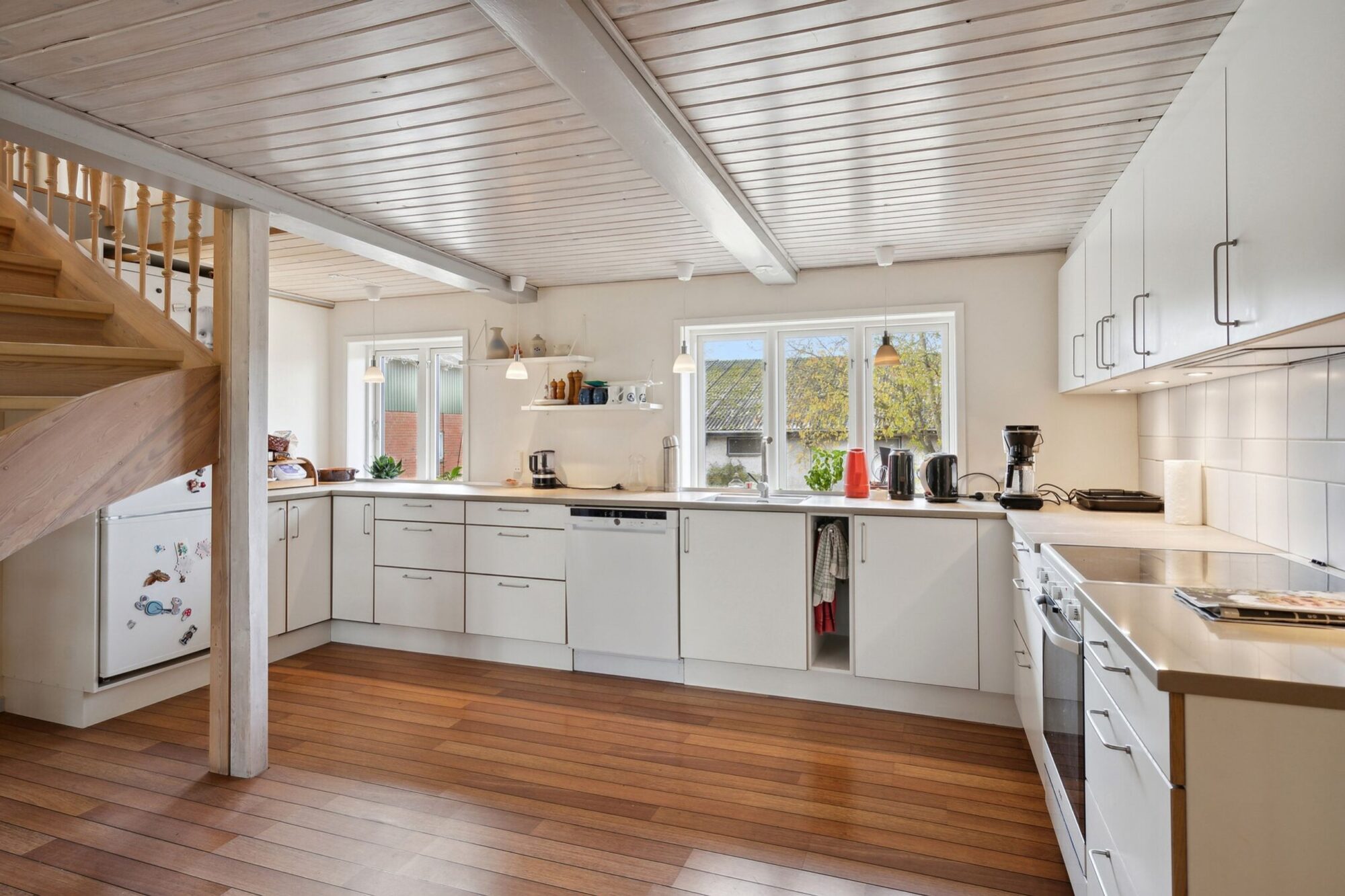 Stuehuset er i fin stand og har en entre, bryggers, badeværelse samt dejligt køkken alrum med trappe til 1 salen. Endvidere vinkelstue samt værelse. 1 salen er indrettet med stort repos, som i dag benyttes til kontor samt 2 værelser.