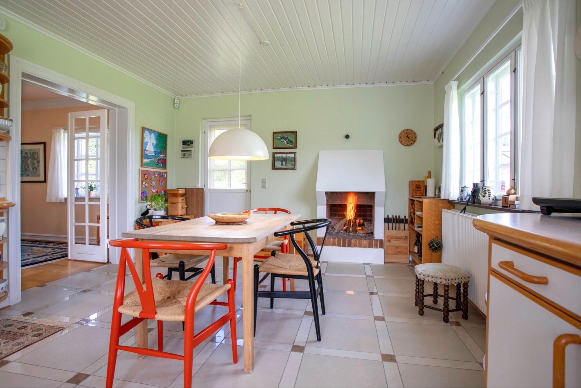 I stuehuset bydes man indenfor i en entre, med adgang til køkken/alrum med pejs, hyggelig spisestue og en vinkelstue. I stueplan findes ligeledes et værelse, kontor, fyrrum foruden et badeværelse og et gæstetoilet.