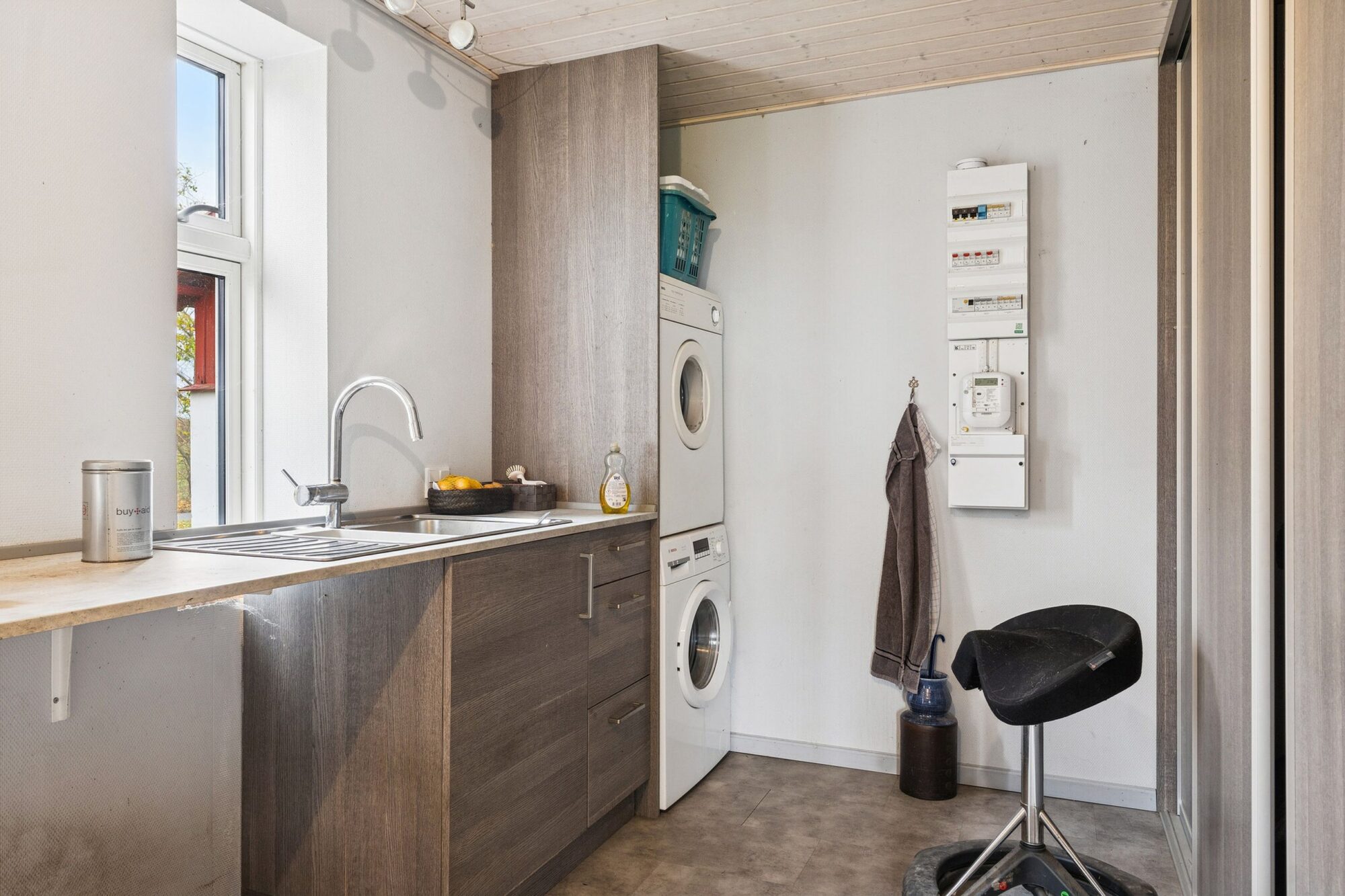 Stuehuset er indrettet med bryggers, badeværelse, mindre køkken med spiseplads og adgang til spisestue i åben forbindelse med stuen, hvorfra der er udgang til en stor terrasse og den hyggelige have. Herudover findes entré og depotrum.